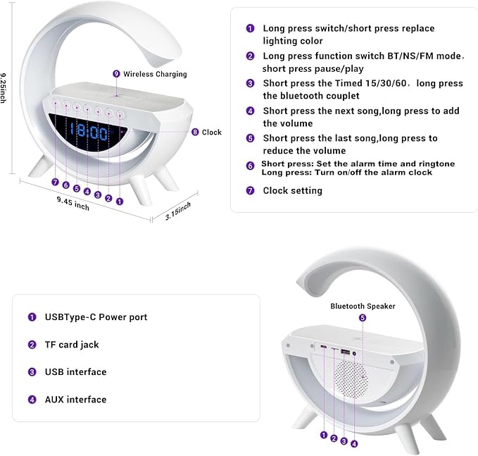 أباجورة عصرية بتصميم دائري أنيق علي شكل حرف G، بإضاءة RGB متعددة الألوان، سماعة بلوتوث مدمجة، شاحن لاسلكي للموبايل، ساعة رقمية ومنبه وراديو FM — مثالية لغرفة النوم والمكتب والهدايا.